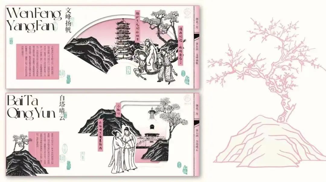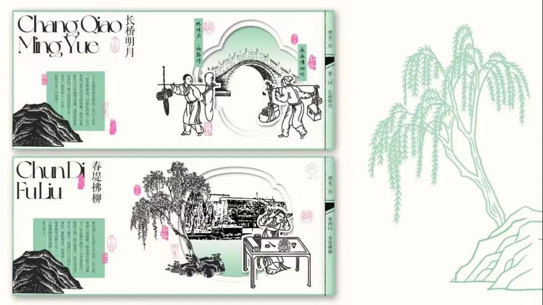 “煙花三月”是為宣傳揚州地區獨特的人文風光以及地域風物所構建的文化旅游品牌。從晚明金陵刊本插圖中提取視覺表征將揚州地區著名的八景圖像作黑白木刻效果處理,在保留其建筑外觀與結構線條的基礎上賦予了濃厚的文脈意蘊突出揚州文化名城之身份。