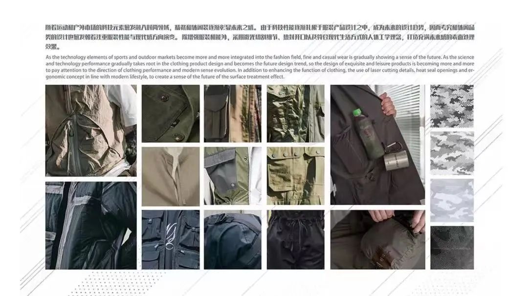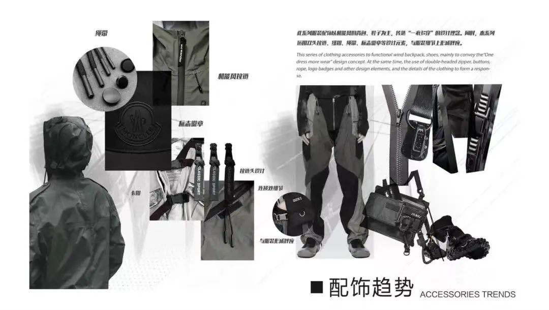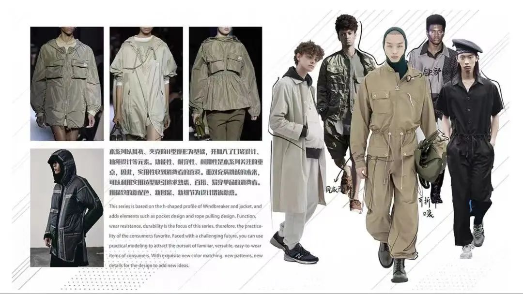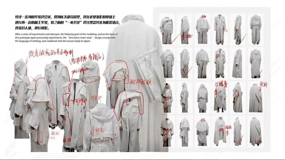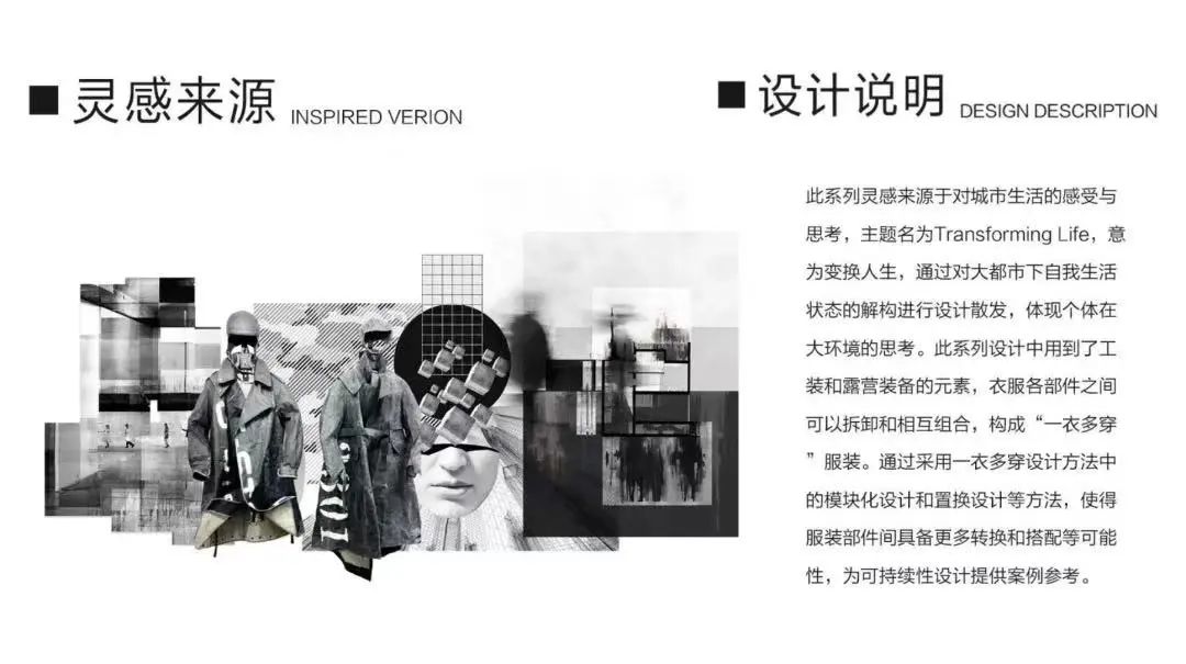 此系列靈感來源于對城市生活的感受與思考,主題名為Transforming Life,意為變換人生,通過對大都市下自我生活狀態的解構進行設計散發,體現個體在大環境的思考。此系列設計中用到了工裝和露營裝備的元素,衣服各部件之間可以拆卸和相互組合,構成“一衣多穿”服裝。通過采用一衣多穿設計方法中的模塊化設計和置換設計等方法,使得服裝部件間具備更多轉換和搭配等可能性,為可持續性設計提供案例參考。