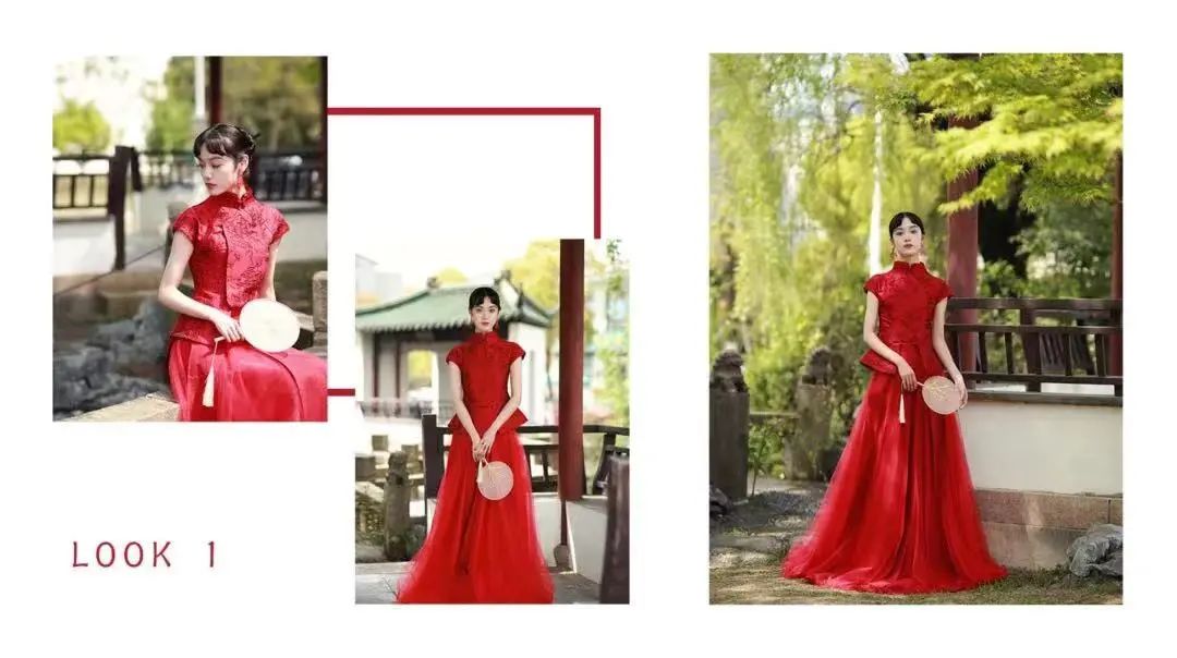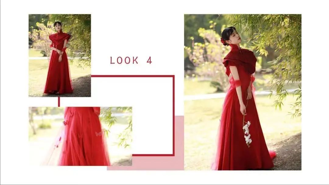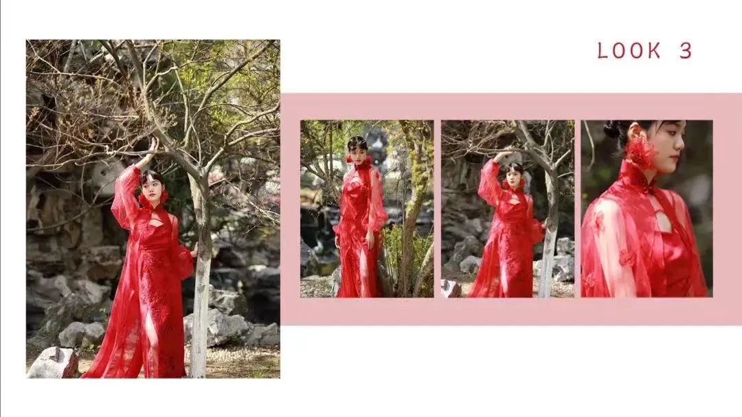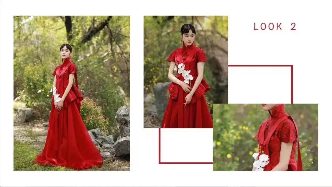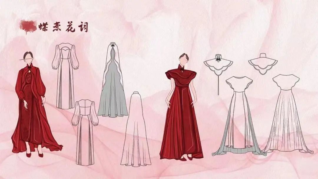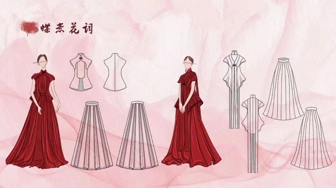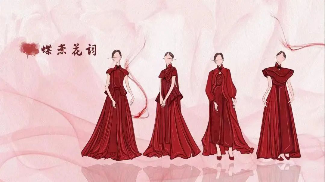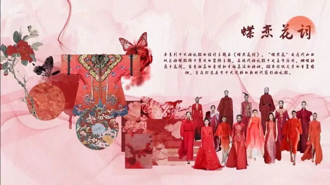 本系列中式婚禮服的設計主題為《蝶戀花詞》,“蝶戀花”是近代山西地區婚嫁服飾中常用的裝飾主題,在現代婚禮服中也多有應用,蝴蝶翩飛于花間,寓意甜美的愛情和幸福美滿的婚姻,擯棄傳統元素的重復堆砌,旨在打造具有中式風格的新時代簡約婚禮服。